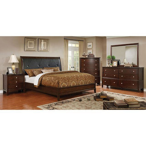 FOA EastThis stately bed set features a classic rich espresso finish, ornate metal scrollwork along the mirrored headboard trim and carved wooden details. ...