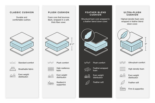 - High-density foam cushions wrapped in feather-fiber blend jacket