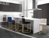 Make sure guests stay comfortable as they wine and dine from this Heidi Cream Velvet Stool. This stool has a sleek metal base finished in gold for a chic look and is upholstered in sumptuous cream velvet for a touch of glam. The upholstery is top quality and has a sleek, velvety feel against the skin for a refined and elegant presentation. The armless design facilitates conversation, and a footrail on the bottom gives you a spot to rest your feet while you dine.
