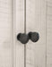- Aged iron-color hardware